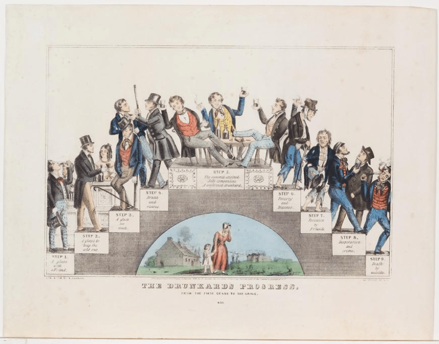 The Drunkard’s progress. Steps: 1. A glass with a Friend 2. A glass to keep the cold out 3. A glass too much 4. Drunk and riotous 5. The Summit attained Jolly Companions A Confirmed Drunkard 6. Poverty and Disease 7. Forsaken by Friends 8. Desperation and crime 9. Death by suicide. Springfield Museums. “The Drunkards Progress. From the First Glass to the Grave., Nathaniel Currier.” Springfield Museums, November 3, 2015. https://springfieldmuseums.org/collections/item/the-drunkards-progress-nathaniel-currier/.