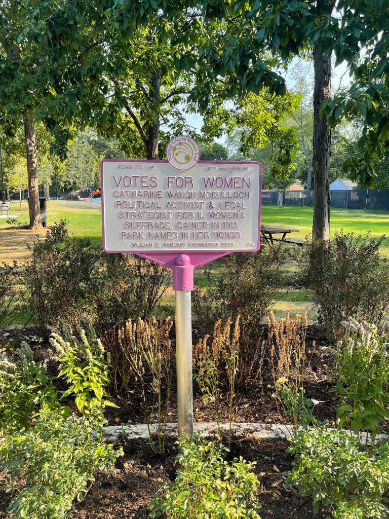 Evanston was home to many suffragists and its critical role in the state and national suffrage movement was documented and highlighted in 2020, the 100th anniversary of the 19th amendment. One of the projects that connected Evanston with the commemoration was the National Votes for Women Trail. A project of the National Collaborative for Women’s History Sites (NCWHS), and funded by the Pomeroy Foundation, the trail includes historic markers placed at sites significant to the suffrage movement in each state. Three markers have been placed in Illinois – in Chicago (Alpha Suffrage Club), in Oak Park (Grace Wilbur Trout), and in Lombard (Ellen Martin). The fourth site is in Evanston at the public park named in McCulloch’s honor and is part of a planned renovation of the park.